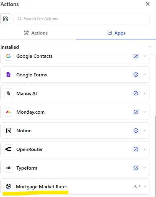 Search for "Mortgage Market Rates" within your actions or browse for it under Action Apps.