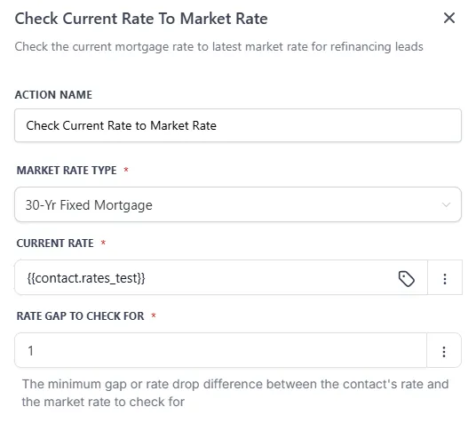 The Mortgage Market Rates Checker is an app within your CRM workflow automation Actions that checks contacts' mortgage rates against market rate automatically to determine qualification for refinancing.