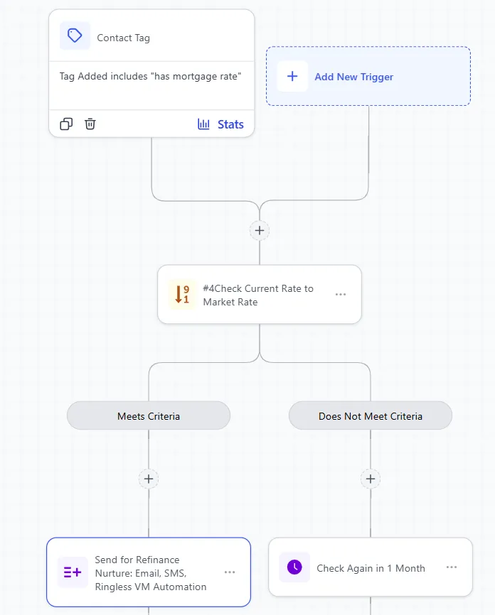 Add a step at the end of "Meet Criteria" flow for all contacts that meet the criteria. For example, send contacts that meet criteria to a different workflow for email and voicemail drop outreach to nurture and convert for refinancing